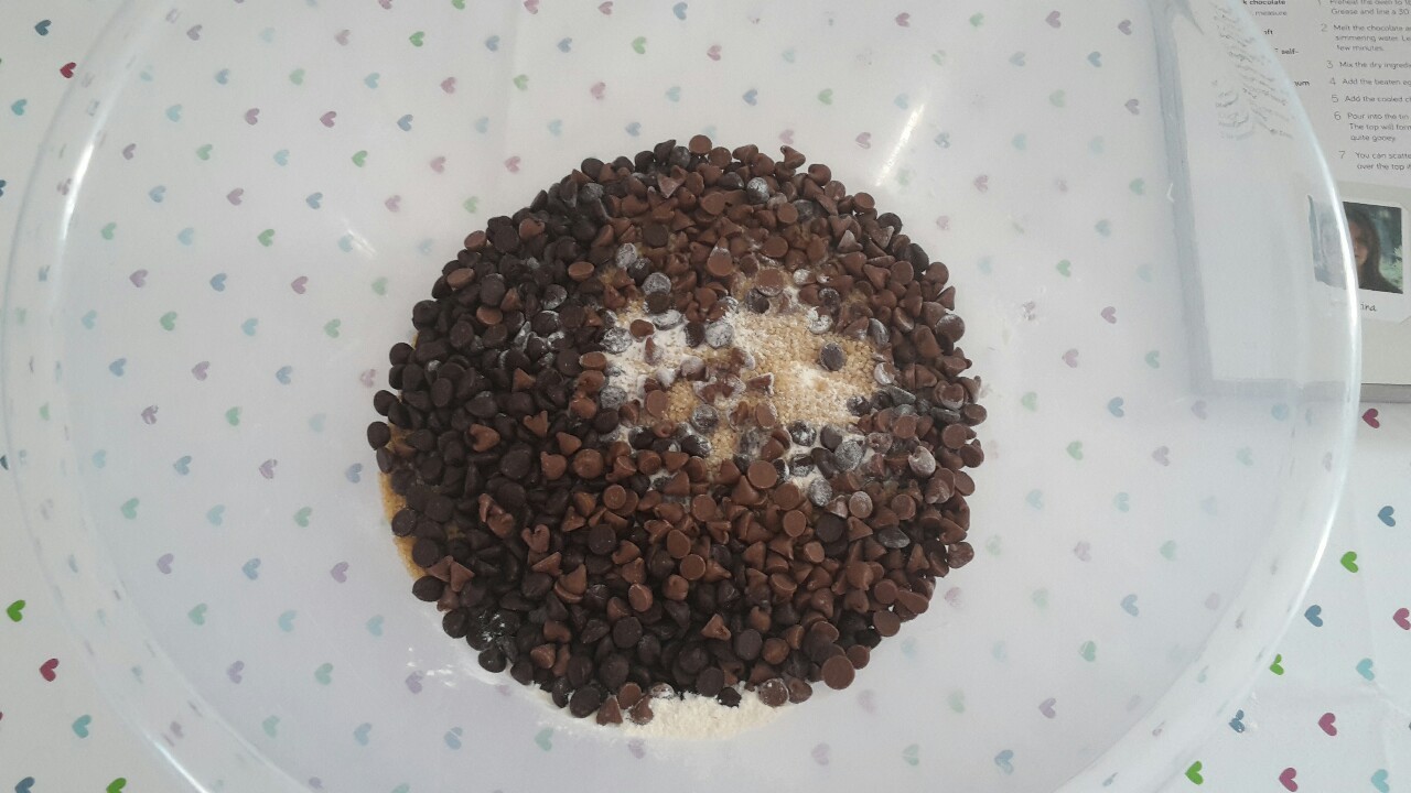 GF SF flour, baking powder, xanthan gum, brown sugar and chocolate chips